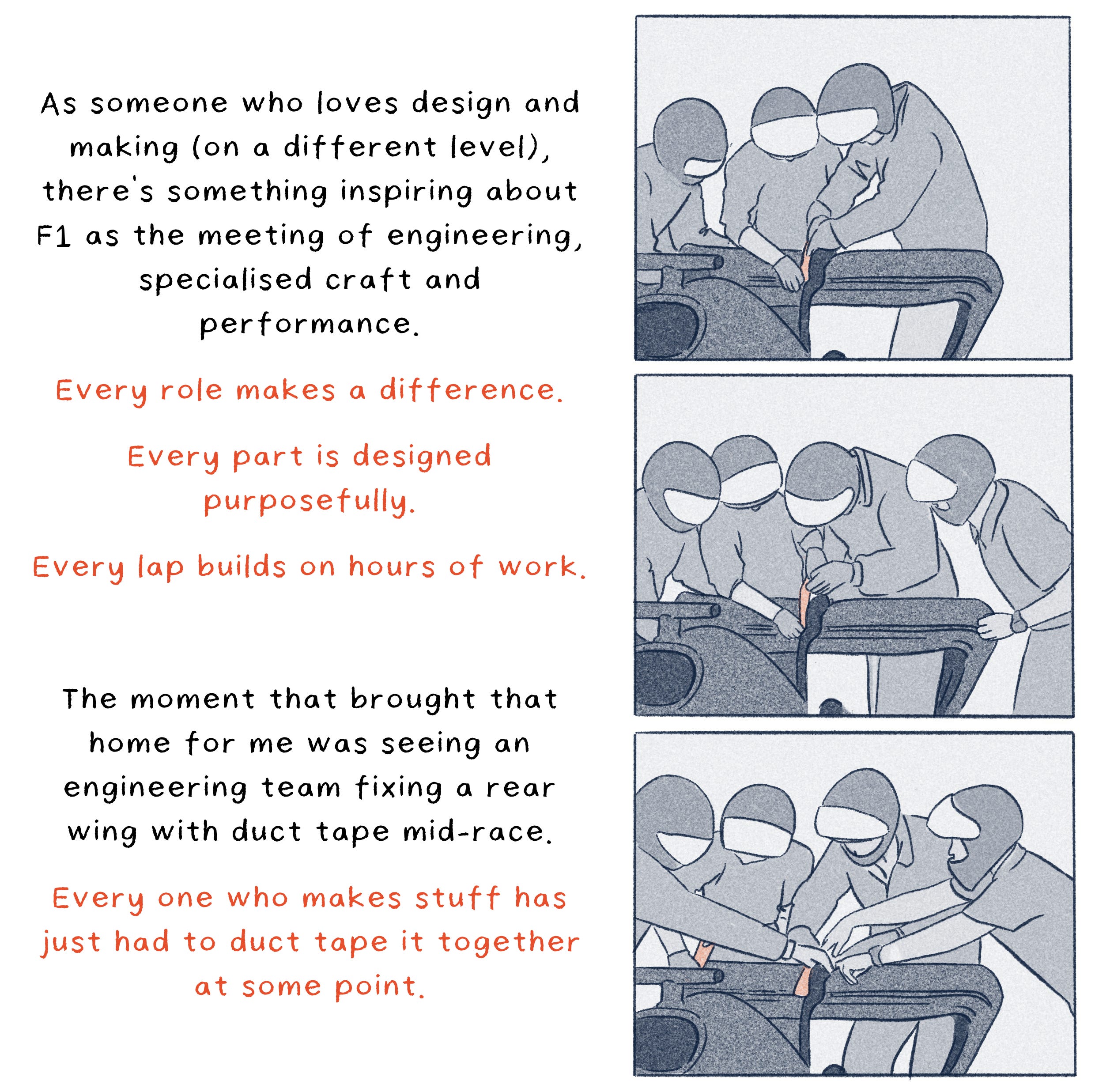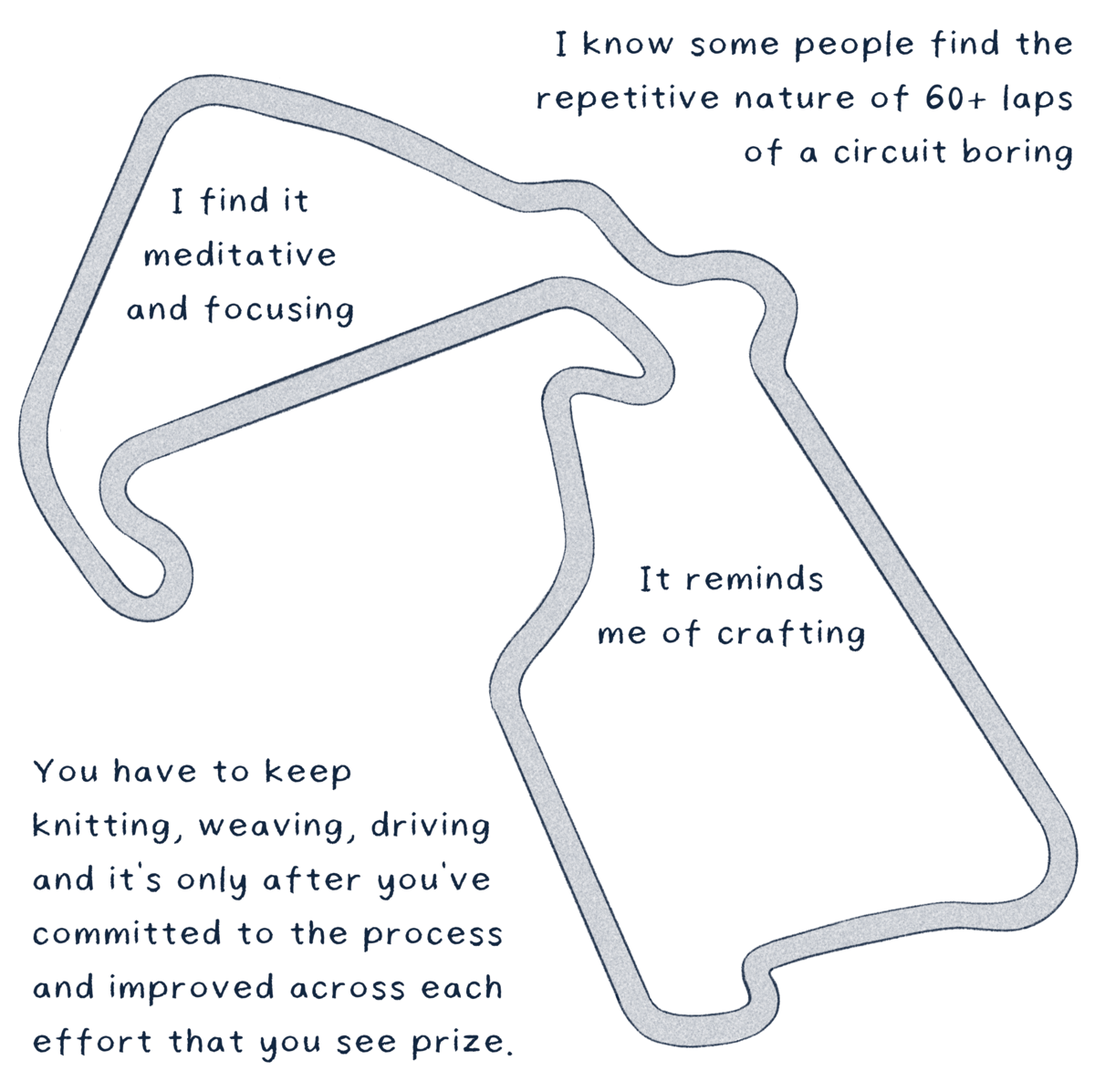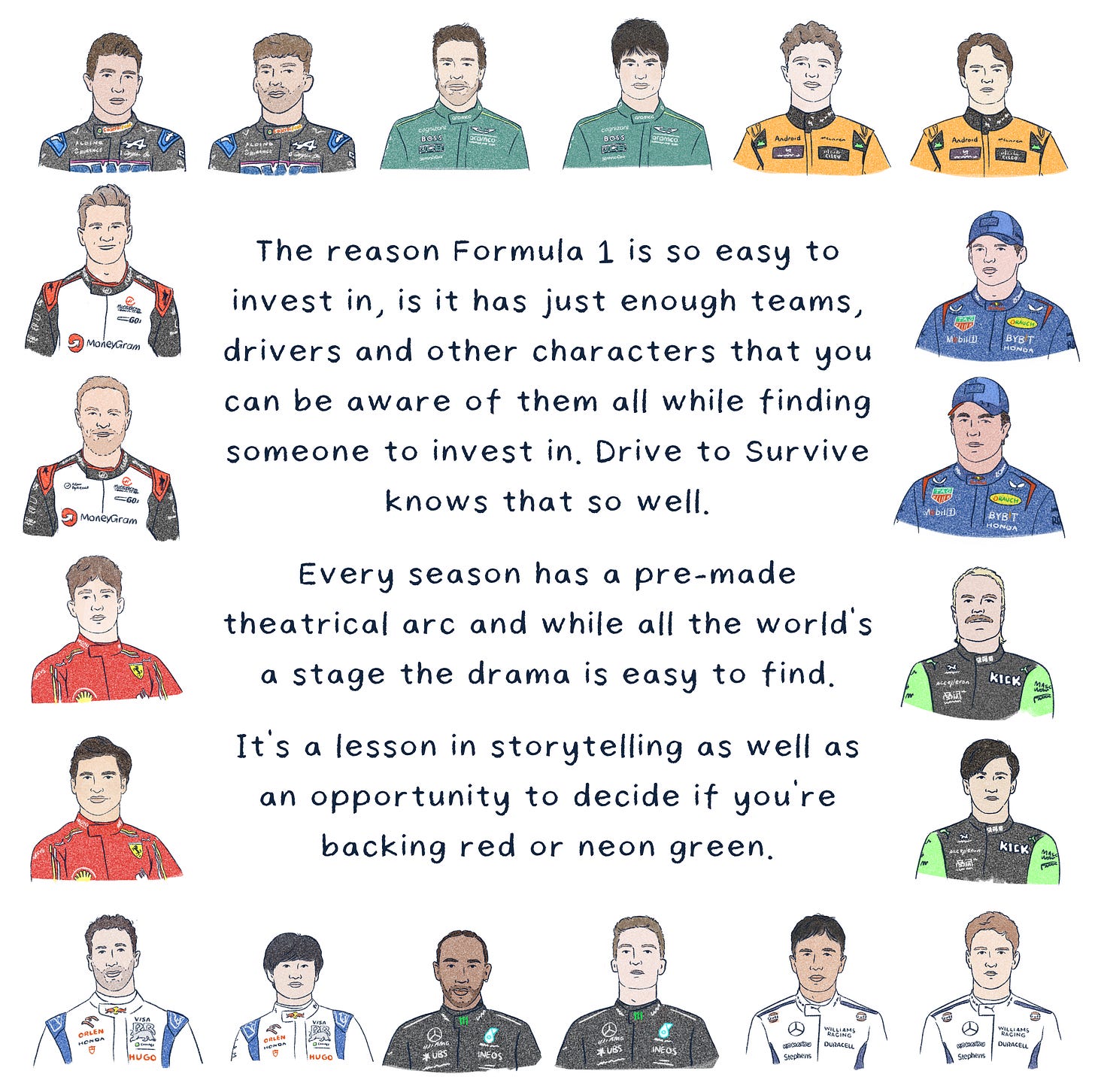 As this newsletter is fast becoming something of a place for answers I wish I had given, here’s what I should have said about why Formula 1 is a creative salve for me.